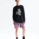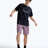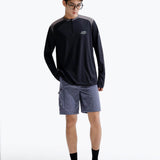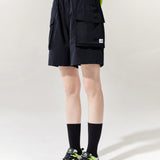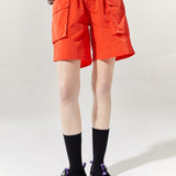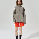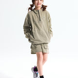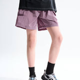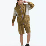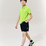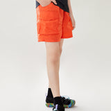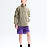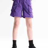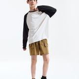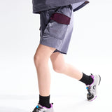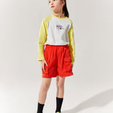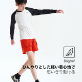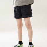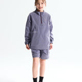 NOC-Shineのショートパンツの紹介。グレーのTシャツとオレンジのショートパンツを着た男の子と、白と黄色のラグランTシャツを着た女の子のカジュアルスタイル NOC-SHINEシリーズのメタリックナイロン素材の説明。耐久性、防風性、撥水性、通気性、紫外線カット機能を備えた高機能ウェアの特長 NOC-Shineの軽量で快適なジャケットとショートパンツを着た少年が走るシーン NOC-Shineのショートパンツのディテール。ウエストゴムとポケットのデザインを強調し、実用性とスタイルを兼ね備えたアイテム NOC-Shineのファブリックテクノロジー。ナイロン生地の質感と耐久性を示すクローズアップショット NOC-Shineのショートパンツのリンクコーデ特集。親子ペアルックやカジュアルなアウトドアコーデの着こなし例を紹介