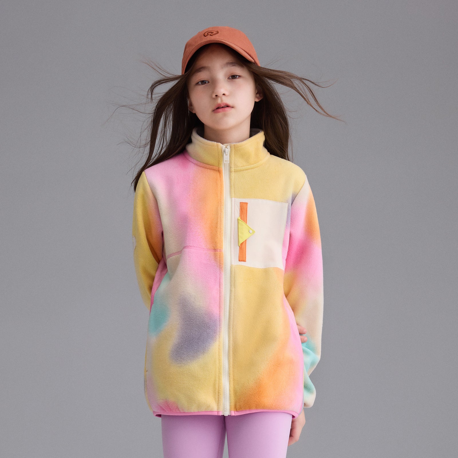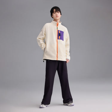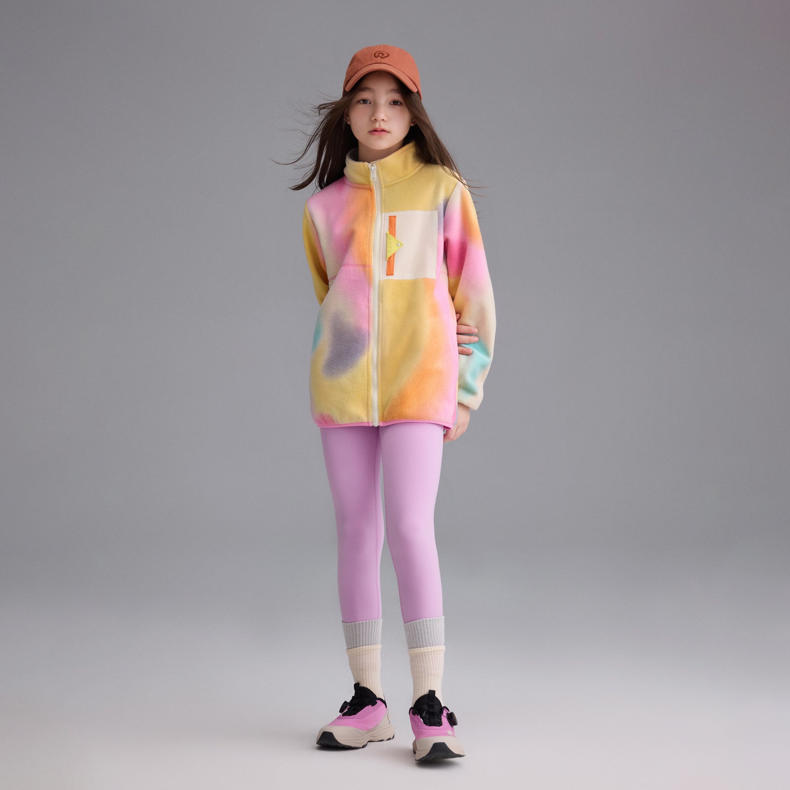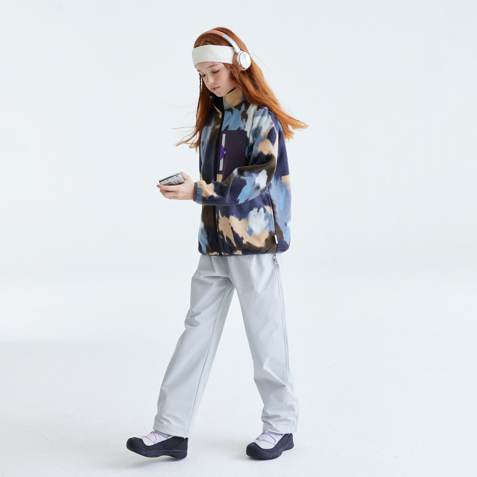 カラフルなNOC-Cloudのサーマルフリースジャケットを着た2人のモデル2人 軽量で保温性や静電気防止機能を備えたNOC-Cloudの素材の説明 280gの軽量素材と75Dの細糸で織られた柔らかいフリース生地のアップ 静電気防止機能付きの迷彩グレーカラージャケットを着たモデル 子供用保護ジッパーやカラーブロックデザインの胸ポケットなどのNOC-Cloudジャケットのディテール紹介 子供用と大人用のシルエットやデザインの違いを示した比較画像 家族やパートナーとお揃いで楽しめるリンクコーデの着用例