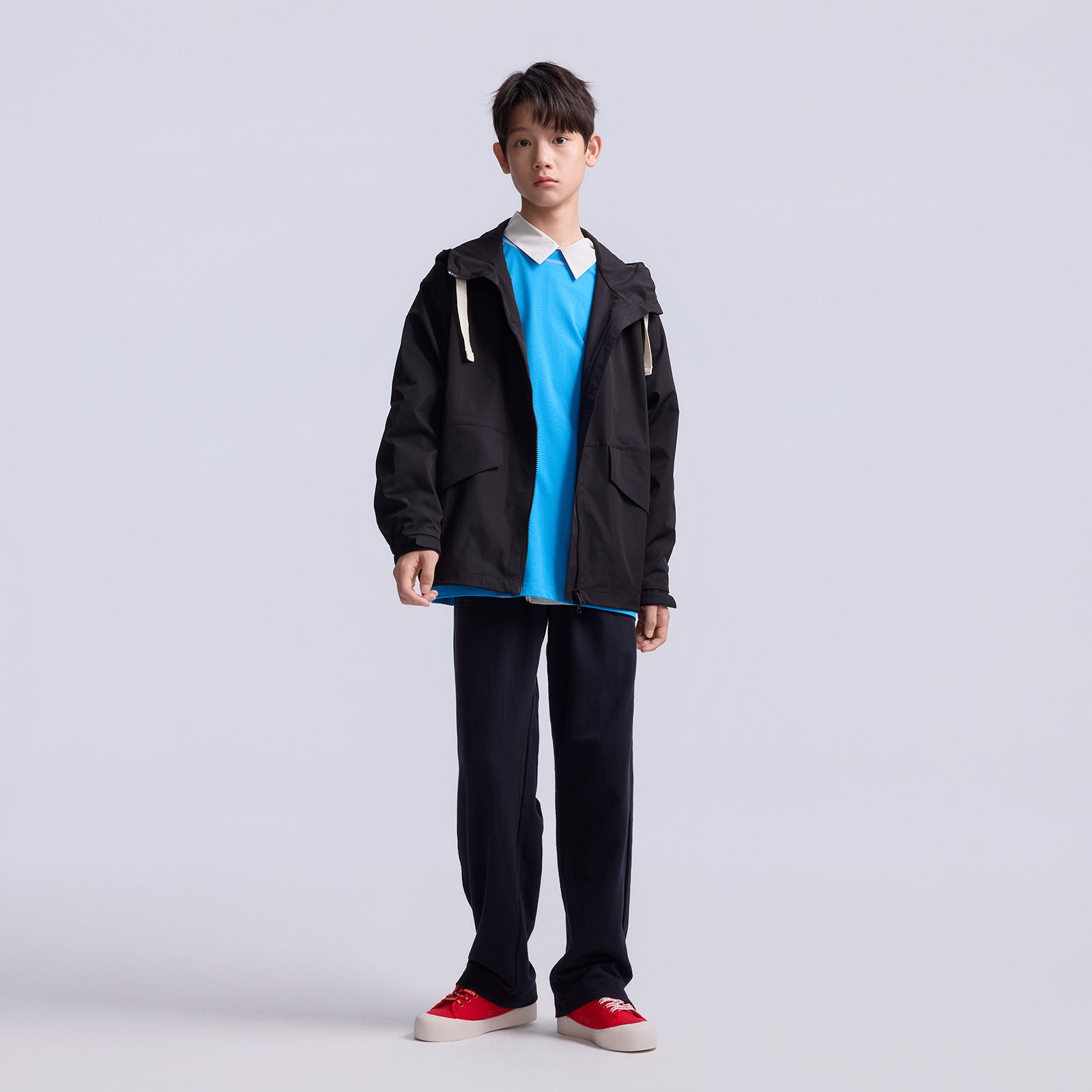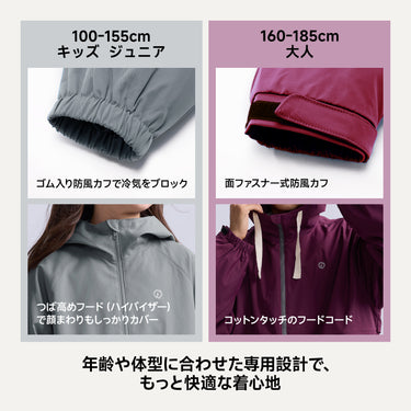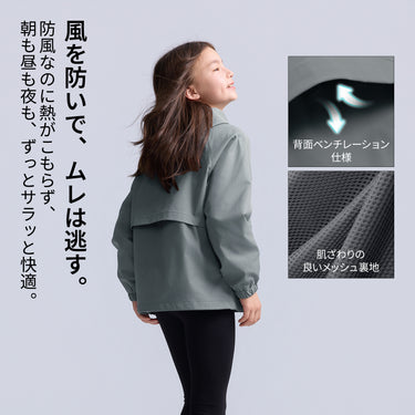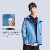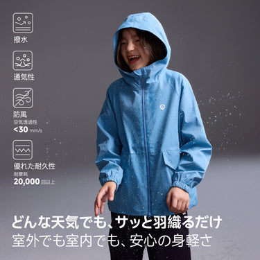 登校や外遊び中の突然の雨風もこれ一枚で安心。撥水加工で小雨をはじき、防風性で冷たい風をシャットアウト。高めのフードが顔まわりを守り、メッシュ裏地で汗をかいても快適。丈夫なつくりで、保護者にもうれしい心強い一枚です。