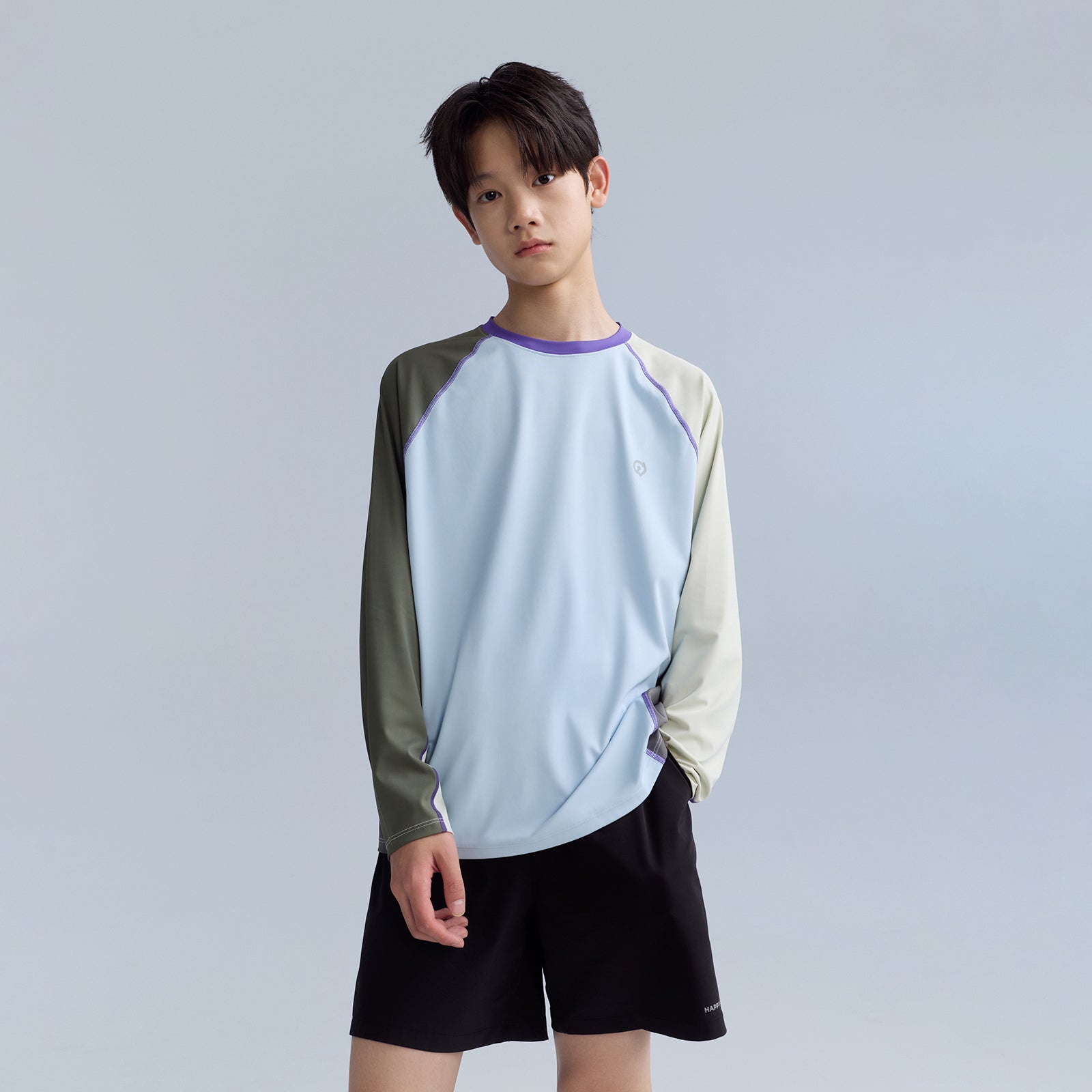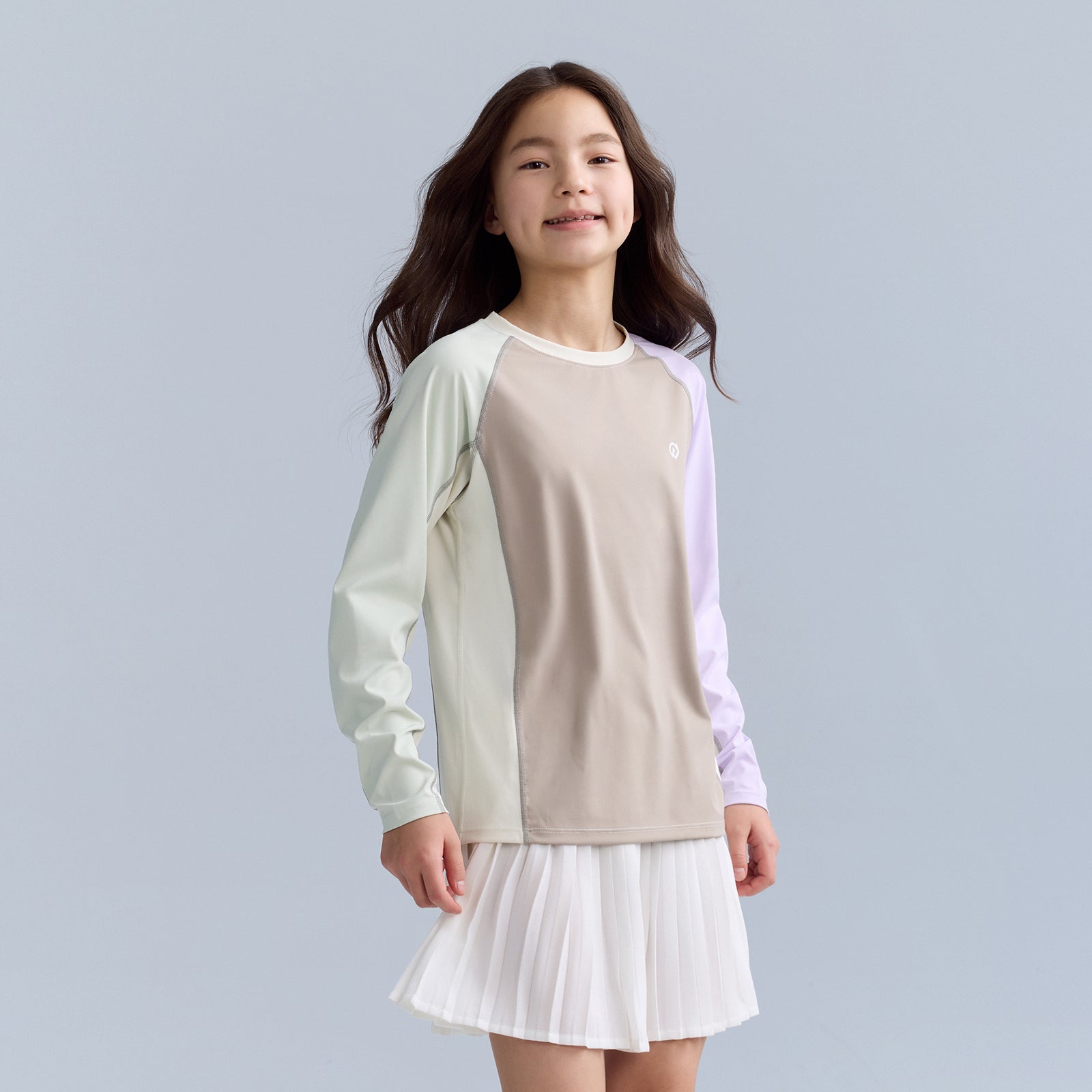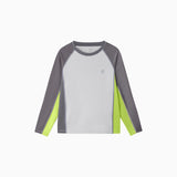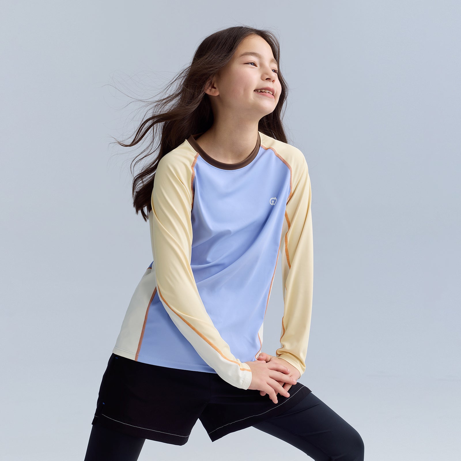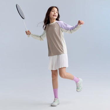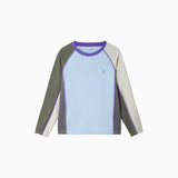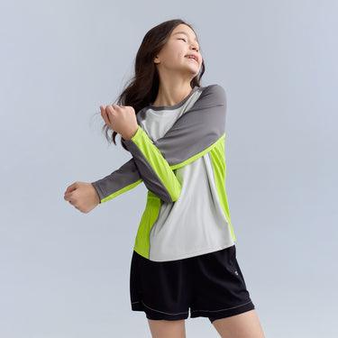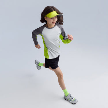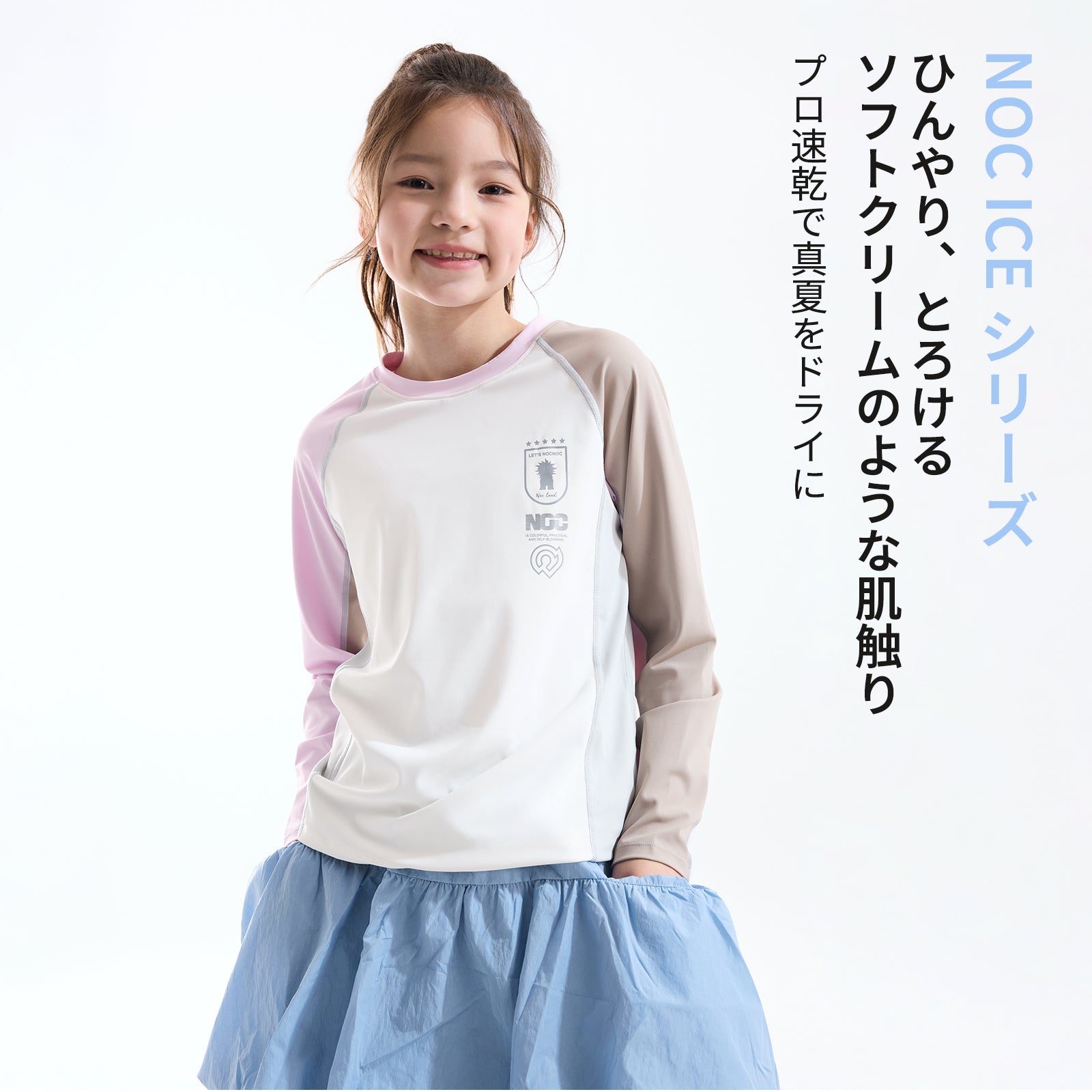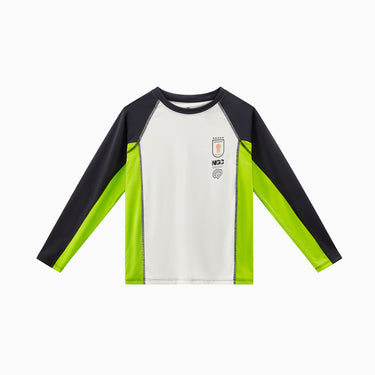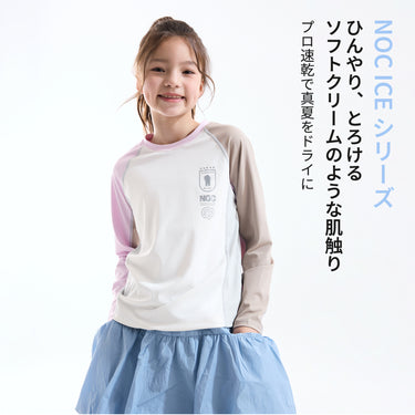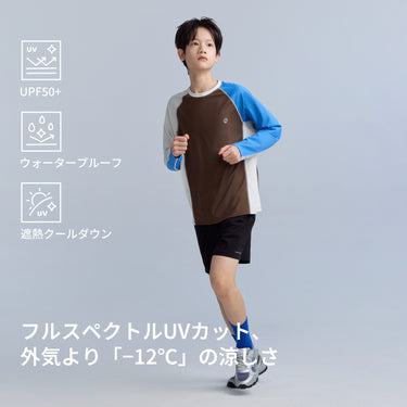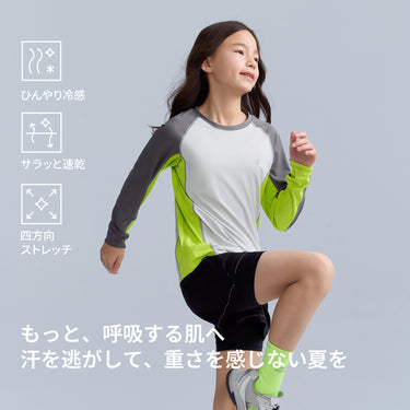 バイカラータイプ、自社開発の「特殊冷感繊維」を使用。肌に触れた瞬間に熱を逃し、汗をかいてもベタつきを残さない、圧倒的な肌離れの良さを実現。UPF50の防晒性能とプロ仕様の速乾性を兼ね備え、真夏でも、お子様の素肌を健やかに、そして自由に動ける一着。