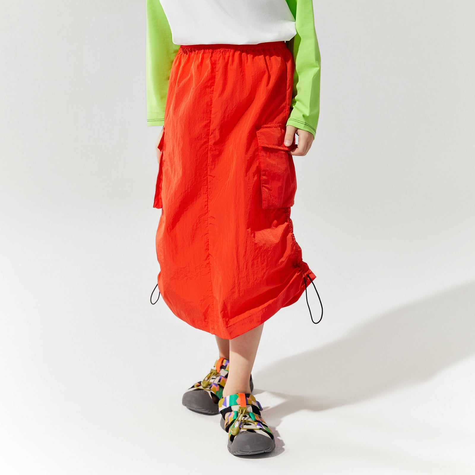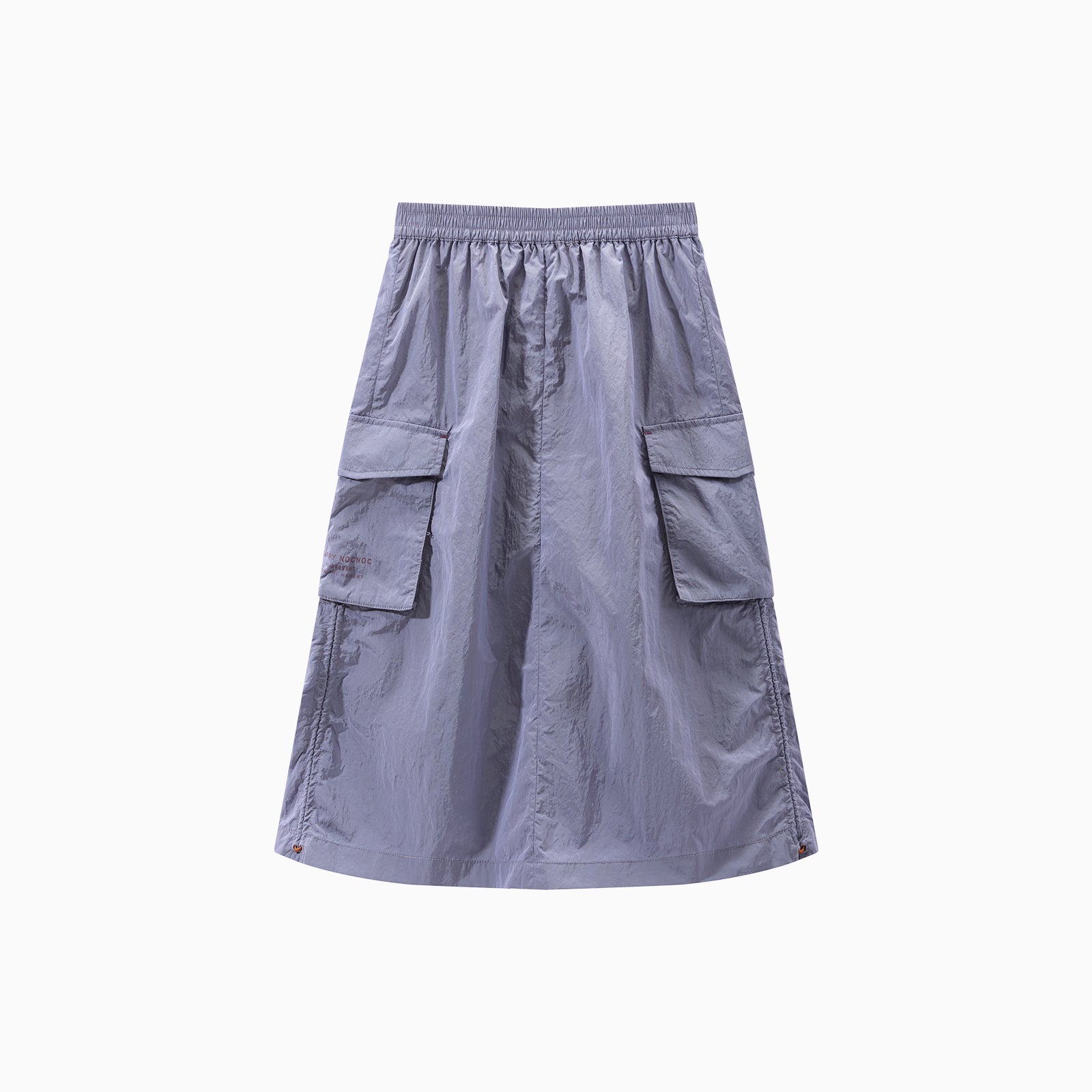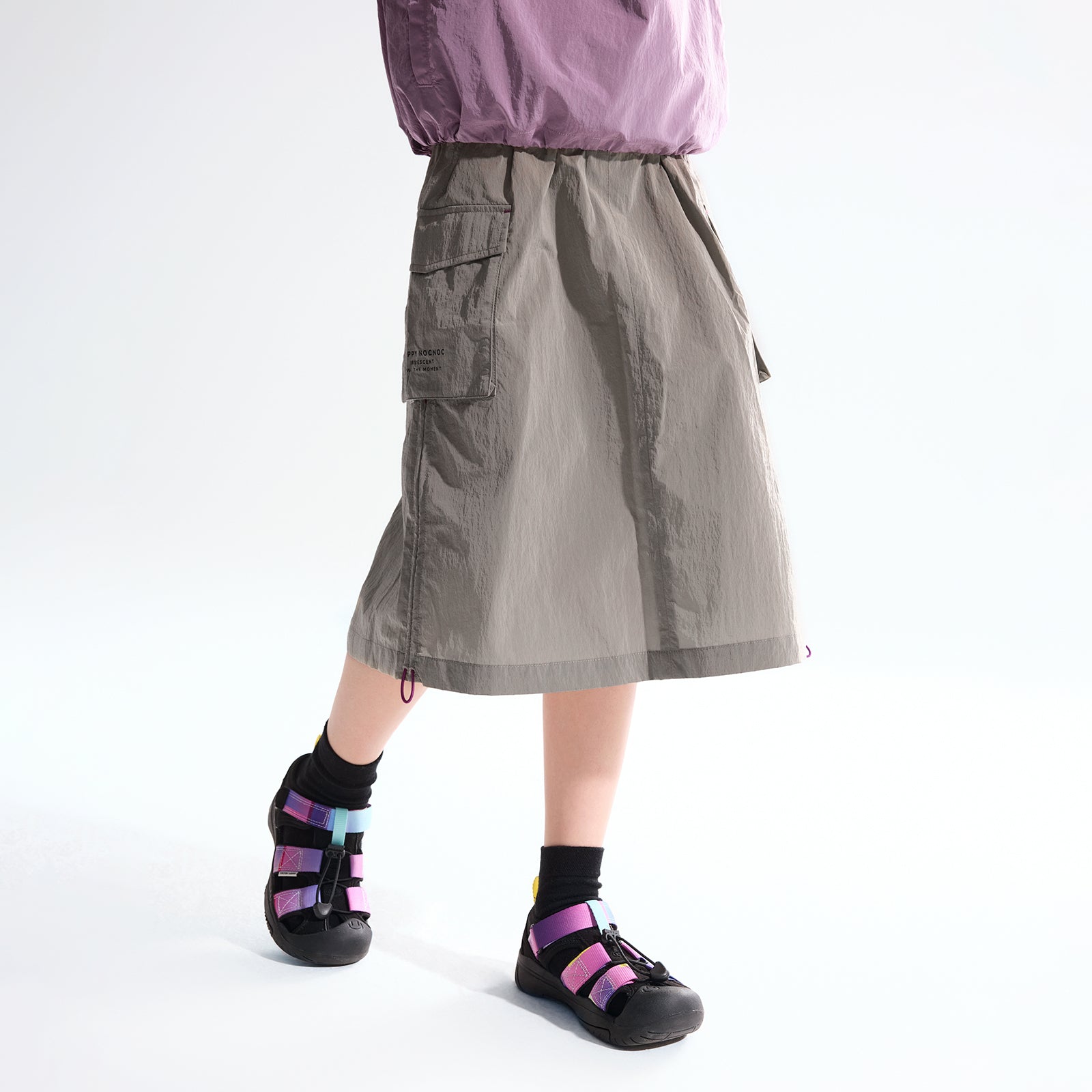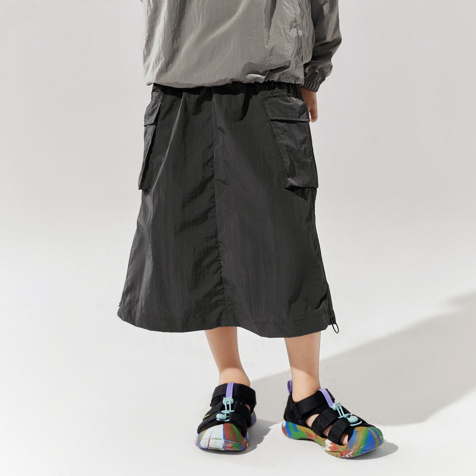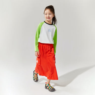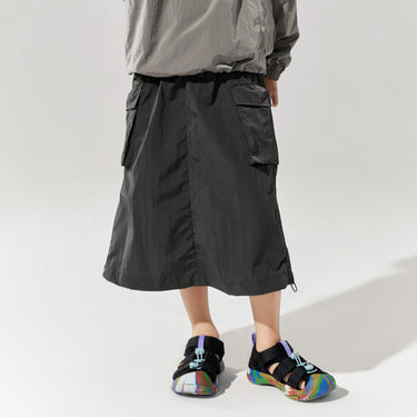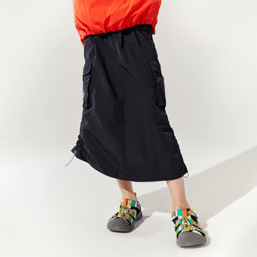 NOC-Shineシリーズのブラックとオレンジのジャケットとロングスカートを着た親子 NOC-Shineシリーズの特長として、光沢感のあるFDYメタリックナイロン素材を使用し、防水・防風・耐久性に優れ、UPF40+の紫外線カット機能を備えた高機能ウェアであることを説明 撥水性や透湿性を備えた高密度生地を使用し、裾のドローコードでシルエットを調整できる機能性が特徴で、小雨や風を防ぐアウトドア仕様 UPF40+の紫外線カット機能を備えたNOC-SHINEシリーズは、軽量で通気性が高く、長時間の外出でも快適に過ごせる設計 伸縮性のあるウエストゴム、カーゴポケット、サイドスリット、裾のドローコードなど、機能的なデザインのディテール NOC-SHINEシリーズの生地は、メタリックナイロンの光沢感が特徴で、撥水性と耐摩耗性に優れたアウトドア向けの高機能ファブリックを採用 NOC-Shineシリーズのロングスカートを活用したリンクコーデの提案として、親子でアウトドアやカジュアルなシーンに合わせた多彩な着こなしを紹介