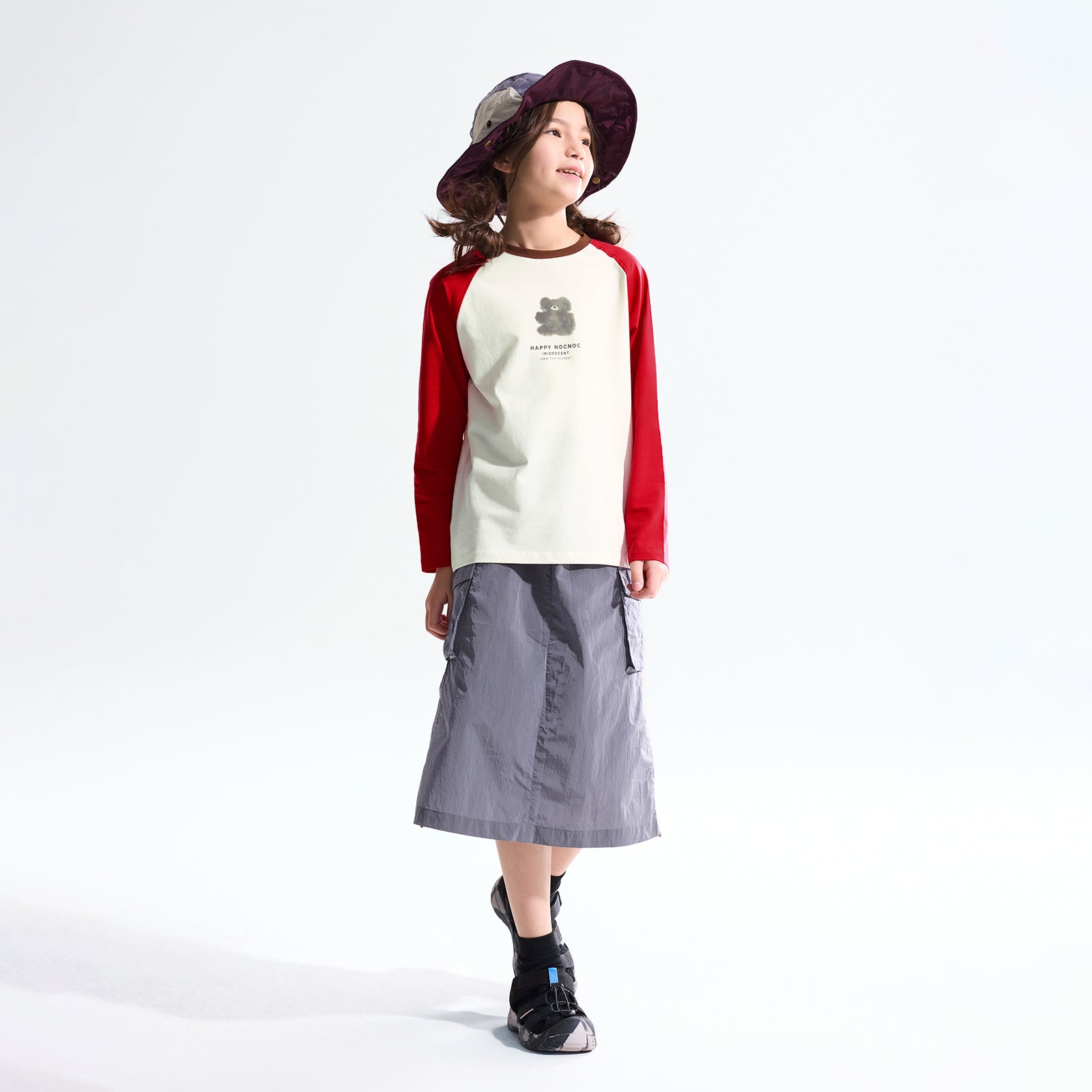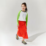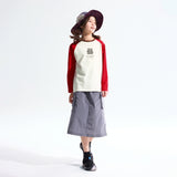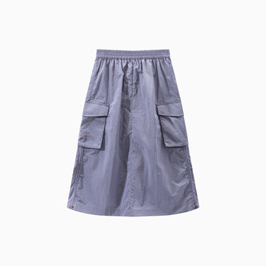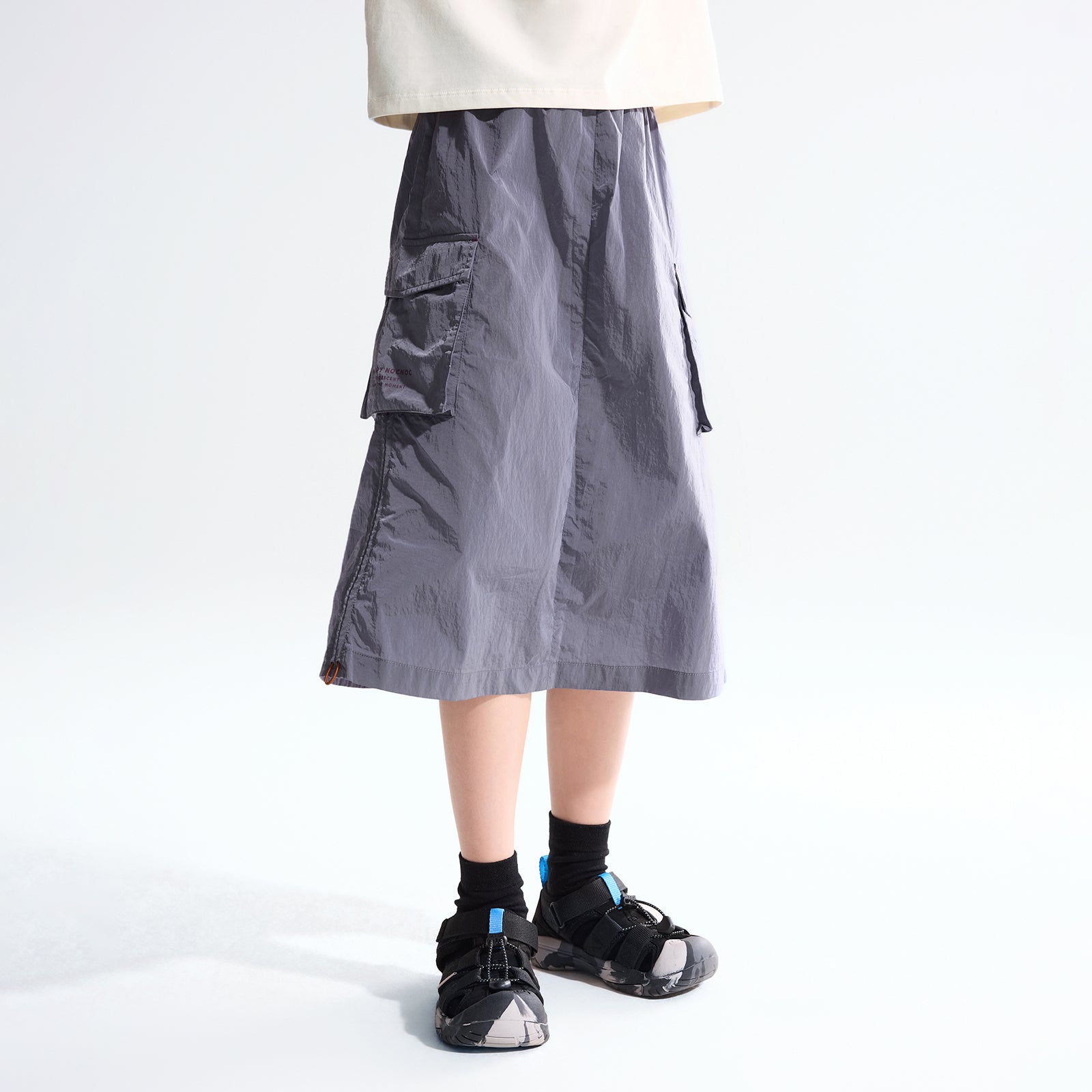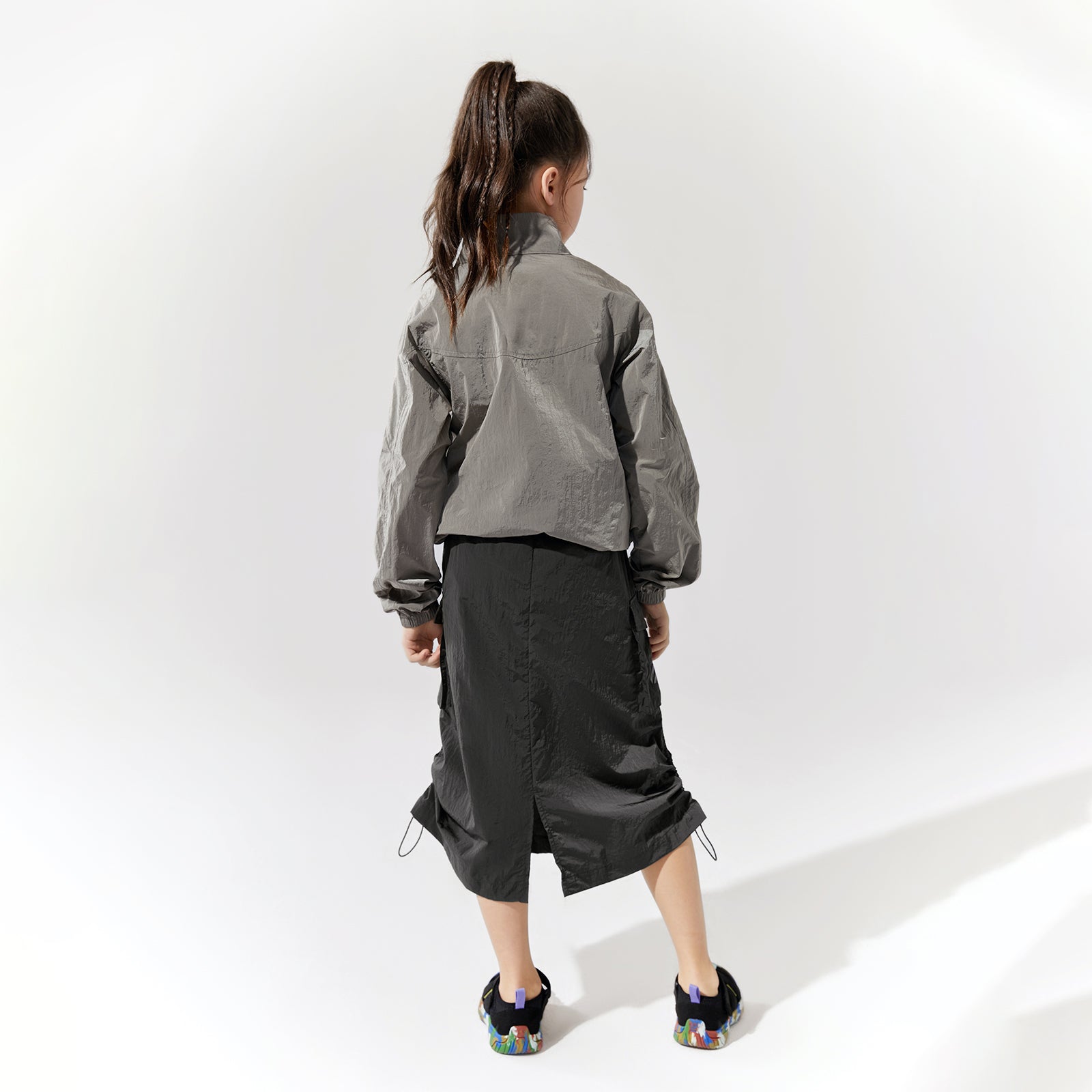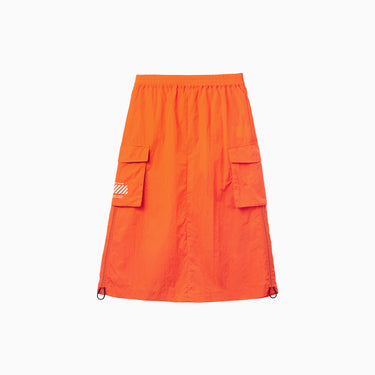 NOC-Shineシリーズのブラックとオレンジのジャケットとロングスカートを着た親子 NOC-Shineシリーズの特長として、光沢感のあるFDYメタリックナイロン素材を使用し、防水・防風・耐久性に優れ、UPF40+の紫外線カット機能を備えた高機能ウェアであることを説明 撥水性や透湿性を備えた高密度生地を使用し、裾のドローコードでシルエットを調整できる機能性が特徴で、小雨や風を防ぐアウトドア仕様 UPF40+の紫外線カット機能を備えたNOC-SHINEシリーズは、軽量で通気性が高く、長時間の外出でも快適に過ごせる設計 伸縮性のあるウエストゴム、カーゴポケット、サイドスリット、裾のドローコードなど、機能的なデザインのディテール NOC-SHINEシリーズの生地は、メタリックナイロンの光沢感が特徴で、撥水性と耐摩耗性に優れたアウトドア向けの高機能ファブリックを採用 NOC-Shineシリーズのロングスカートを活用したリンクコーデの提案として、親子でアウトドアやカジュアルなシーンに合わせた多彩な着こなしを紹介