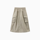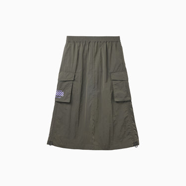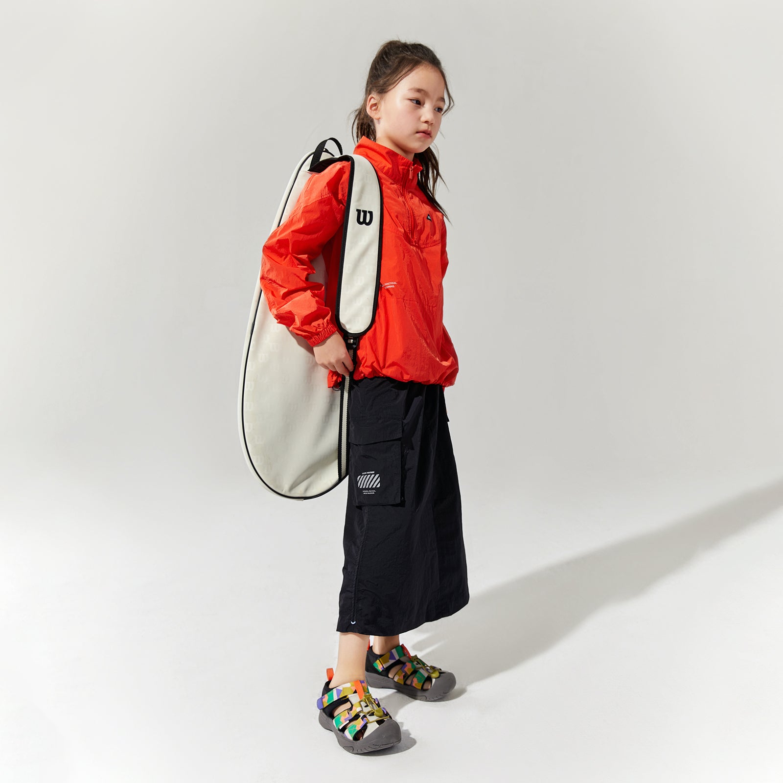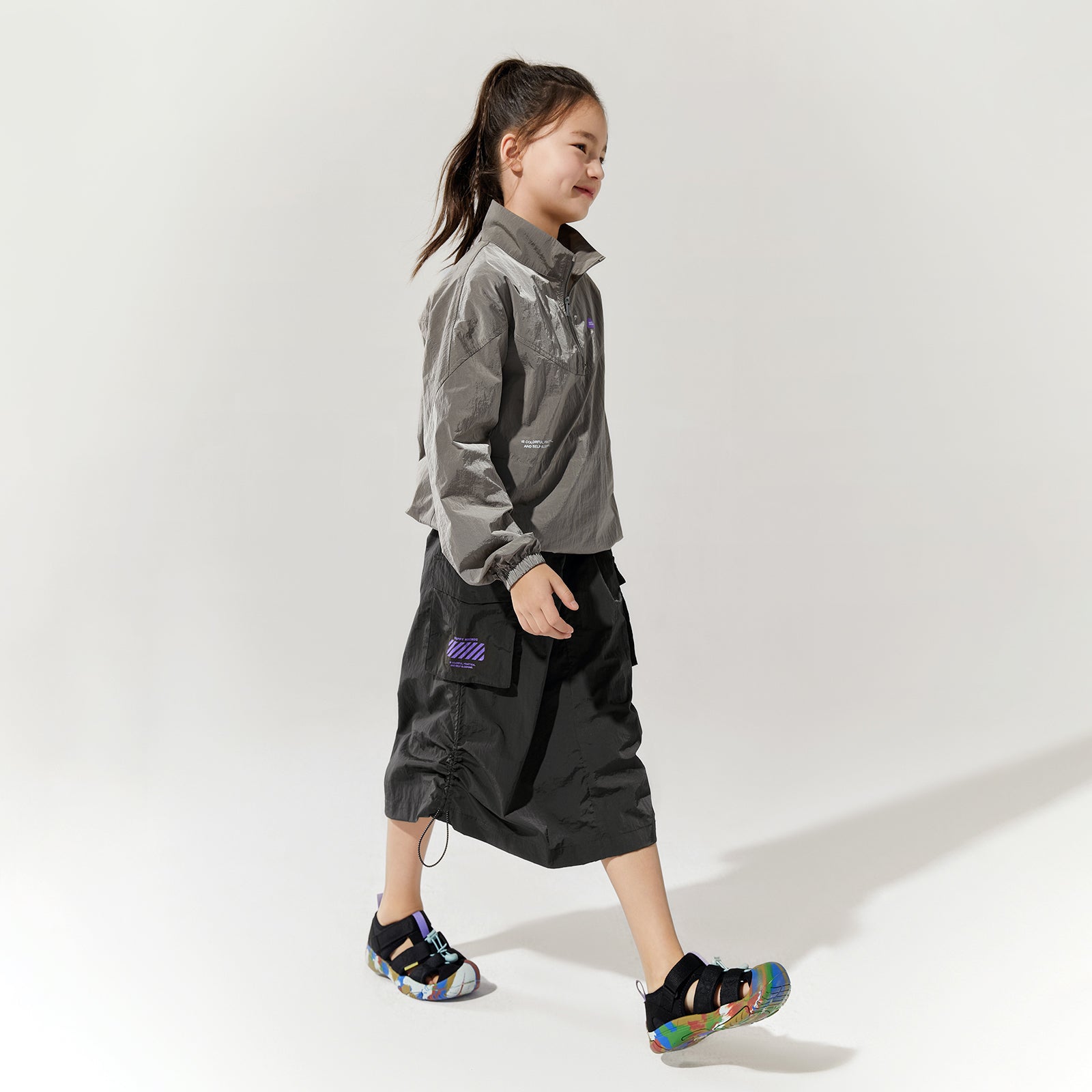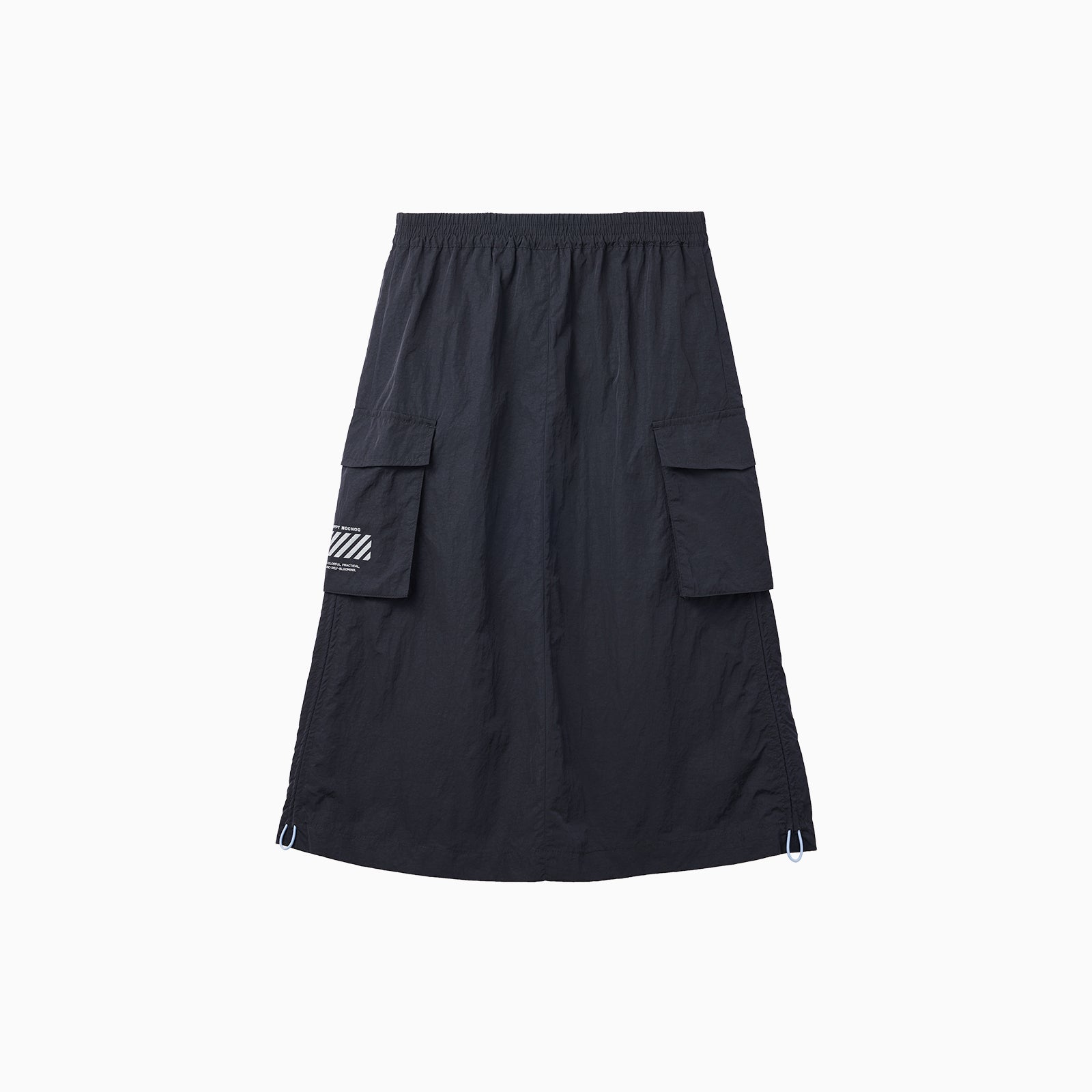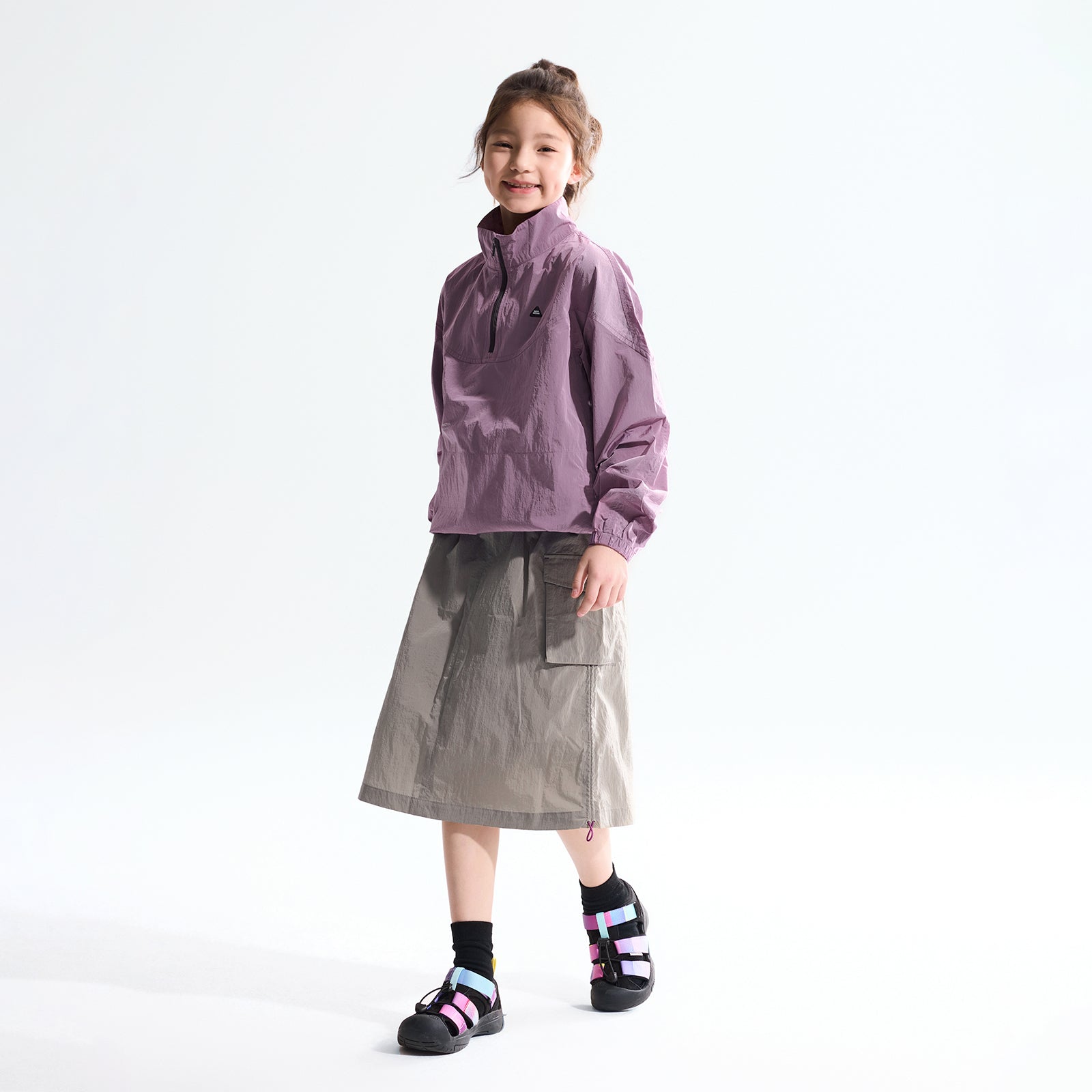 NOC-Shineシリーズのブラックとオレンジのジャケットとロングスカートを着た親子 NOC-Shineシリーズの特長として、光沢感のあるFDYメタリックナイロン素材を使用し、防水・防風・耐久性に優れ、UPF40+の紫外線カット機能を備えた高機能ウェアであることを説明 撥水性や透湿性を備えた高密度生地を使用し、裾のドローコードでシルエットを調整できる機能性が特徴で、小雨や風を防ぐアウトドア仕様 UPF40+の紫外線カット機能を備えたNOC-SHINEシリーズは、軽量で通気性が高く、長時間の外出でも快適に過ごせる設計 伸縮性のあるウエストゴム、カーゴポケット、サイドスリット、裾のドローコードなど、機能的なデザインのディテール NOC-SHINEシリーズの生地は、メタリックナイロンの光沢感が特徴で、撥水性と耐摩耗性に優れたアウトドア向けの高機能ファブリックを採用 NOC-Shineシリーズのロングスカートを活用したリンクコーデの提案として、親子でアウトドアやカジュアルなシーンに合わせた多彩な着こなしを紹介
