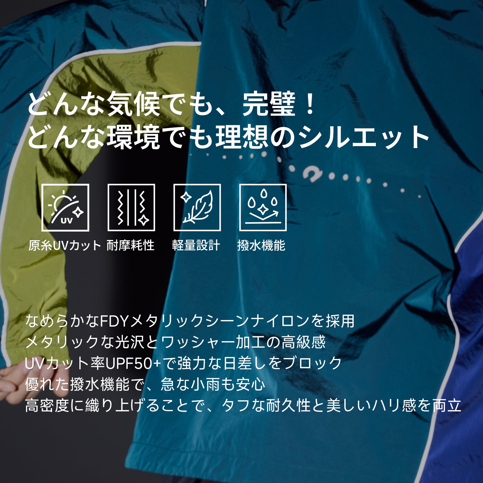 なめらかなFDYメタリックシーンナイロンを採用し、メタリックな光沢とワッシャー加工による高級感を演出。 高密度に織り上げることで、タフな耐久性と美しいハリ感を両立しました。 UVカット率UPF50+で強力な日差しをブロックし、優れた撥水機能で急な小雨にも対応。 さらに、リフレクター機能と、軽量設計で、お子様のアクティブな毎日を安全かつ快適にサポートします。